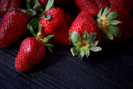 Red juicy strawberry on a dark black wooden background.The droplets of water. Juiciness, vitamins and healthy food