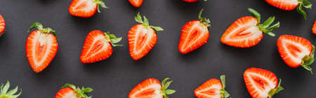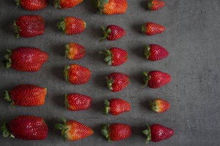 Fresh strawberries in a row on dark grey table. Flat lay photo.