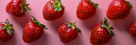 A flatlay photo featuring a vibrant arrangement of ripe strawberries on a bright pink background. The juicy red fruits are neatly placed in a group, creating a visually appealing composition.