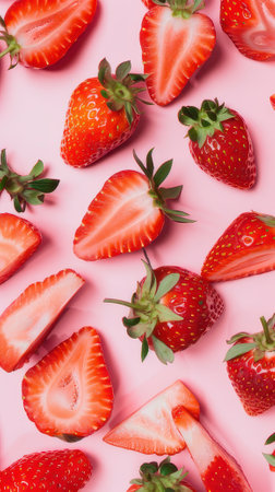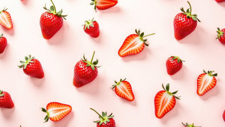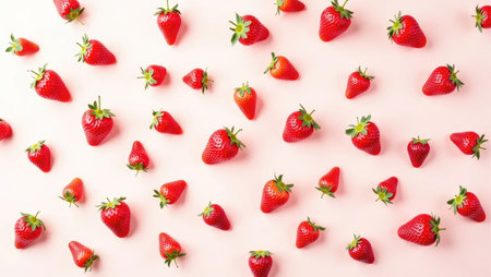 Overhead view of bright red strawberries artistically arranged on a soft pastel background, creating a cheerful and fresh image.