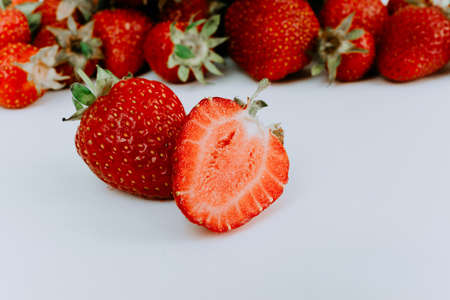Fresh strawberries on a white background. Two sliced strawberries on the background of a hill of strawberries. Group of ripe strawberries with green leaves close-up. Ingredients for juice.