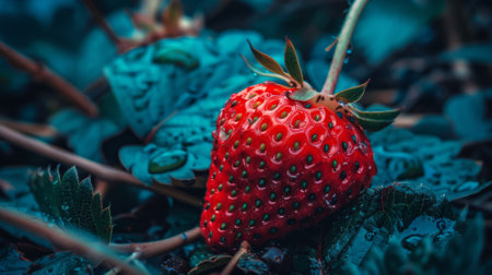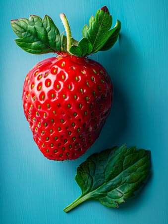 Close up of a Fresh, Juicy Strawberry with Green Leaves on a Vibrant Blue Background Perfect for Healthy Eating, Fruit, and Nutrition Concepts AI Generative