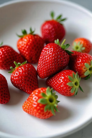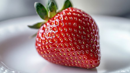 A luscious ripe strawberry sits elegantly on a white plate, showcasing its vibrant red color and glossy surface, perfect for food photography or healthy meal inspiration.