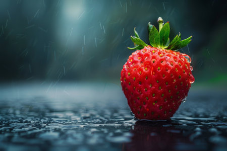 A single, vibrant strawberry with water droplets sits on a wet surface, illuminated by soft rain against a blurred background.