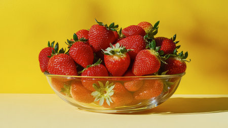 A pile of strawberries resting in a clear glass bowl on a yellow surface, perfect for a fresh summer snack.