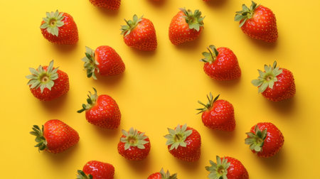 A top-down view of strawberries arranged in a circle on a yellow surface, creating a fun, summery pattern.