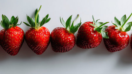 Fresh strawberries with their tops still green, placed neatly on white with a minimalistic feel