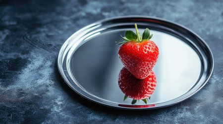 A captivating image of a fresh strawberry placed on a shiny silver tray, showcasing its vibrant color and rich texture against a dark background. Perfect for health and culinary themes.