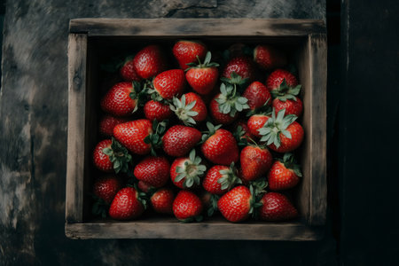 Ripe red strawberries with green leaves arranged in an old wooden box, creating a vibrant contrast against a dark, rustic backdrop