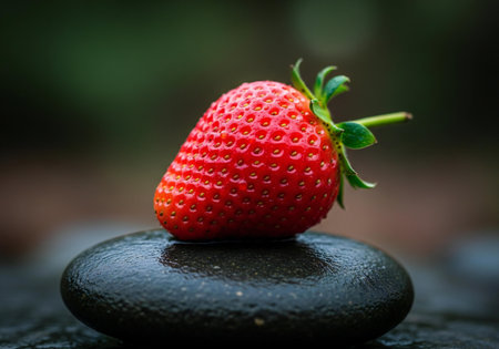 A single, vibrant red strawberry rests on a dark, wet stone, with a blurred natural background.