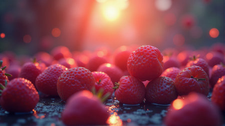 Bright strawberries lie scattered in a lush field, glowing under the warm sunset and highlighting their fresh, vibrant appeal.