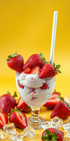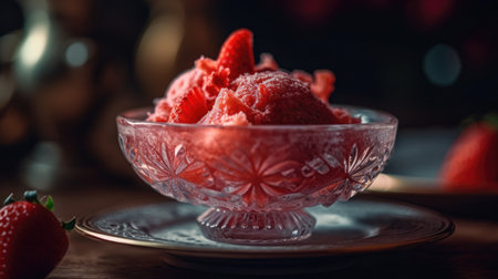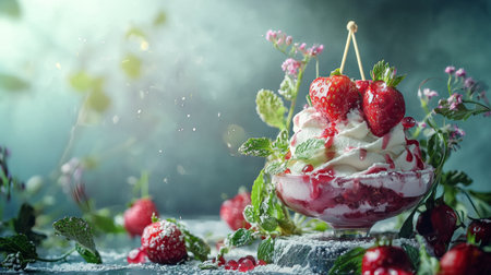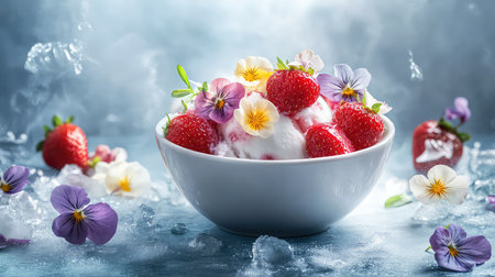 A visually appealing bowl brimming with luscious strawberries, creamy ice cream, and delicate edible flowers, surrounded by sparkling ice crystals.