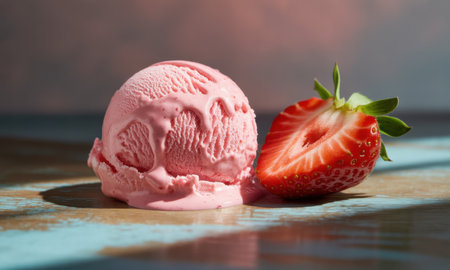 Melting scoop of pink strawberry ice cream next to a vibrant red sliced strawberry on a textured rustic wooden surface, highlighting freshness and summer dessert.