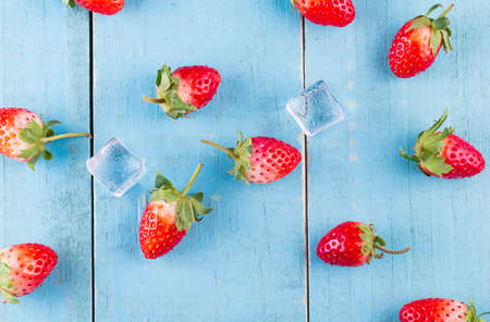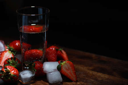 Fresh ripe strawberries on a wooden table and ice cubes with water