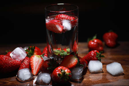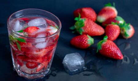 Refreshing summer drink with strawberry and ice in a glass on dark background