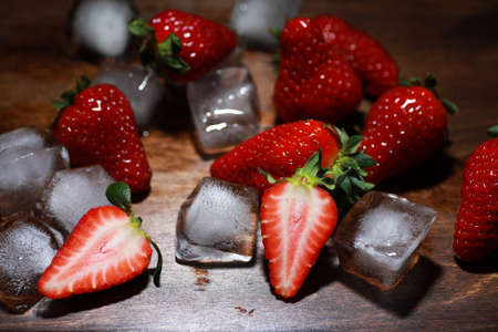 Fresh strawberries with ice cubes on a wooden table