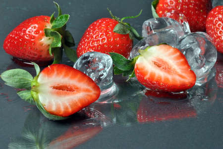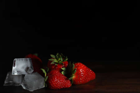 Ice cubes with strawberries on black wooden table