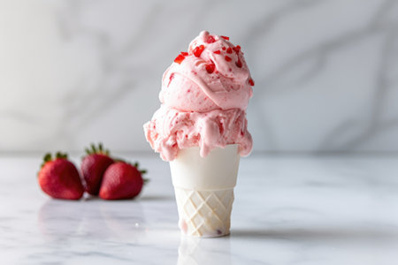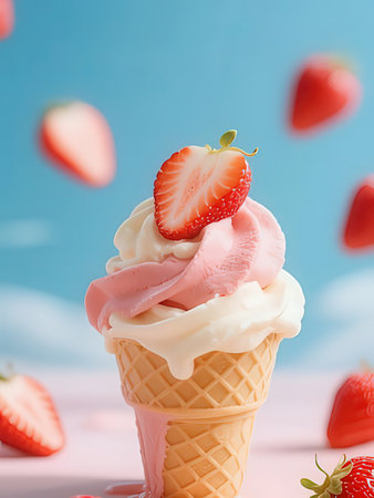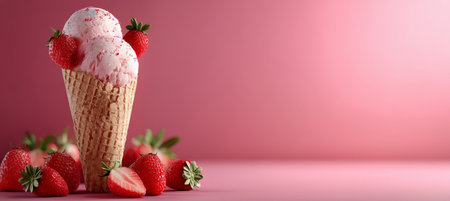 Delicious Strawberry Ice Cream in Waffle Cone on Pink Background, Surrounded by Fresh Strawberries