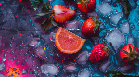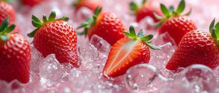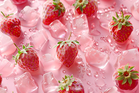 Fresh strawberries arranged with ice cubes on a marble surface in a vibrant and refreshing display