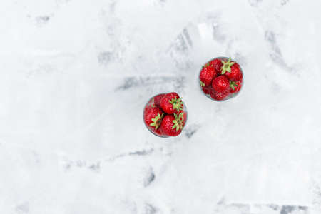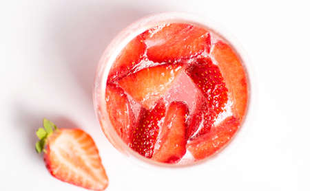 Fresh strawberries in a glass on a white background, top view