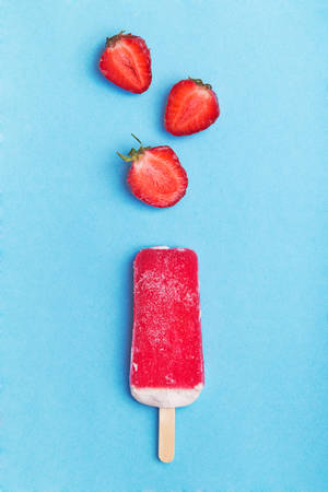 Single homemade ice sticks with strawberry halves on a blue background. Top view with copyspace