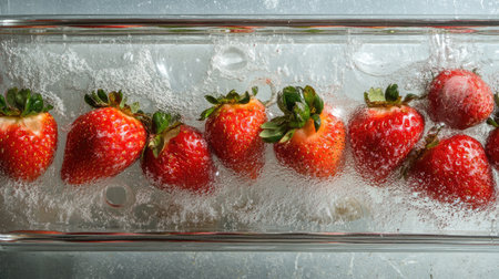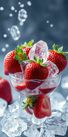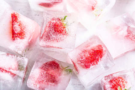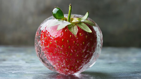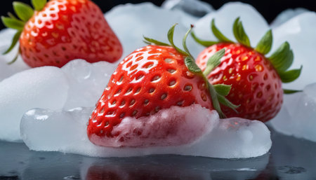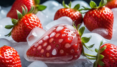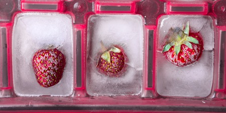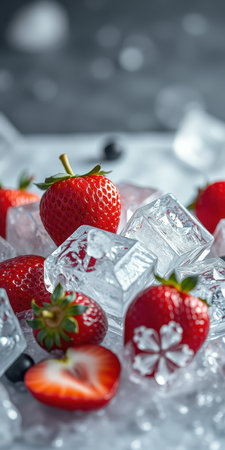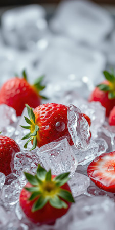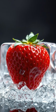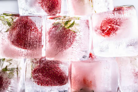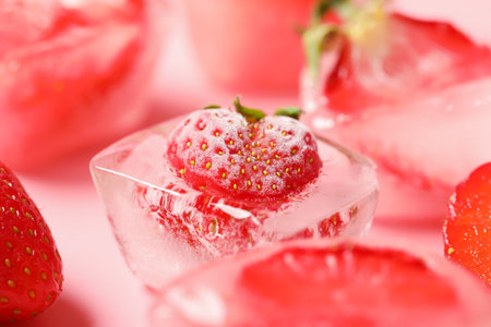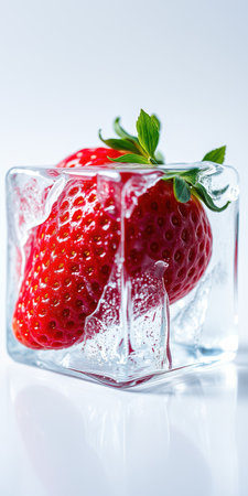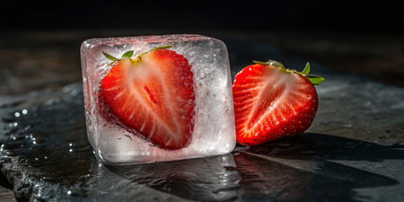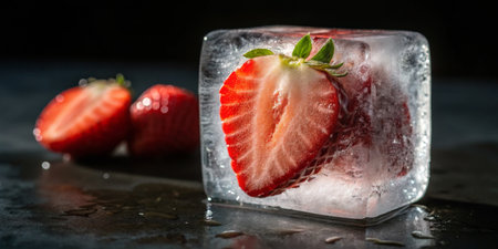 Fresh strawberries encased in ice cube create a striking contrast of colors and textures