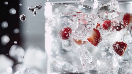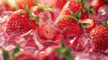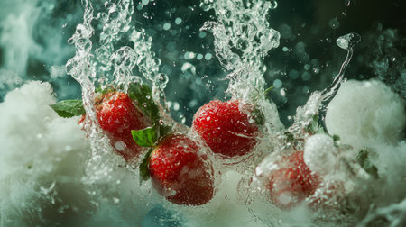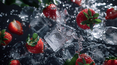 Fresh strawberries captured mid-splash into water with ice cubes, showcasing a dynamic and refreshing scene.