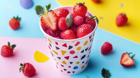 A refreshing display of fresh strawberries and raspberries in a playful cup set against a colorful geometric background, perfect for summer treats.