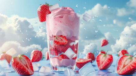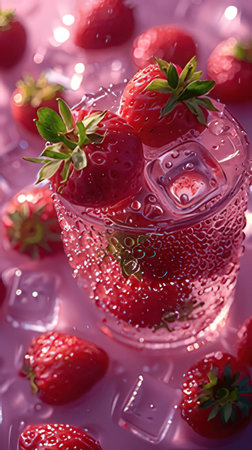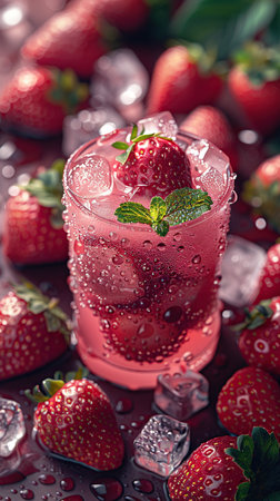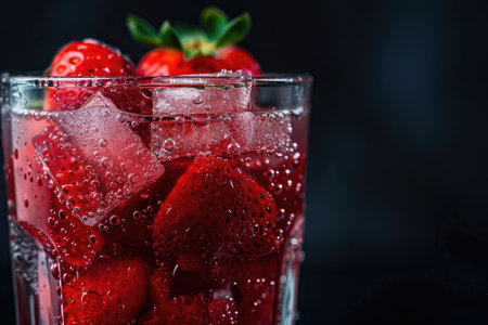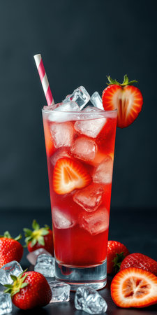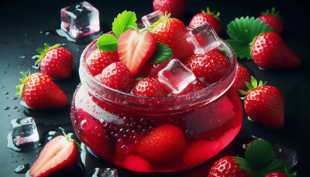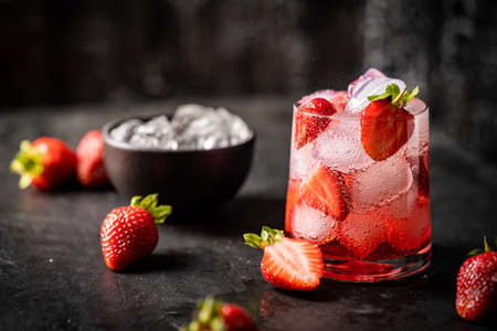 Refreshing strawberry drink with ice and berries on a dark background ready to be enjoyed