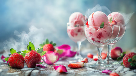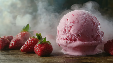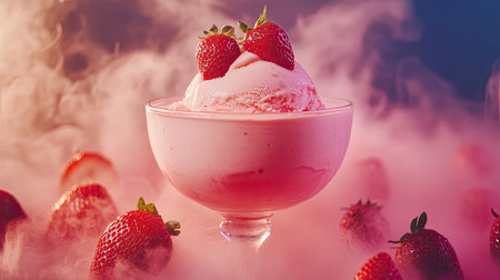 A captivating arrangement featuring a scoop of strawberry ice cream nestled among fresh strawberries, enhanced by a misty, smoky environment. Perfect for showcasing summer desserts.