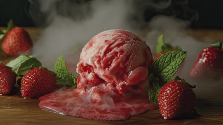 A vibrant scoop of strawberry ice cream is melting beautifully among fresh strawberries and mint leaves, creating a delightful dessert scene with smoke.