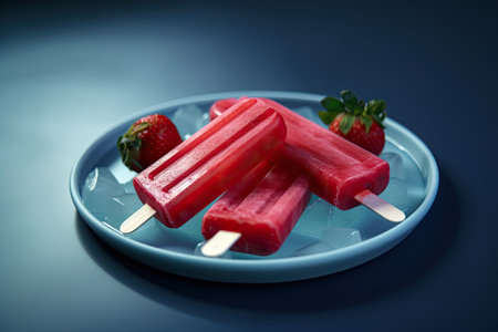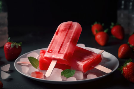 A simple and clean shot of strawberry ice cream popsicles on a white plate, featuring a dark background and space for copy or design