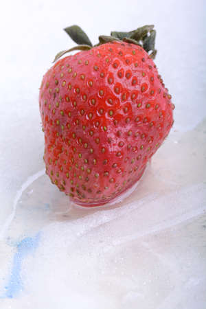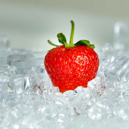 Red fresh strawberry and ice on white plate.