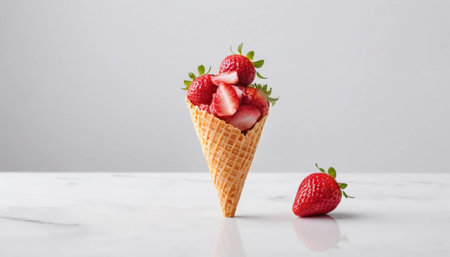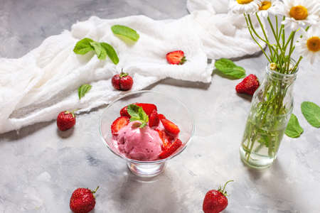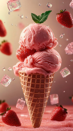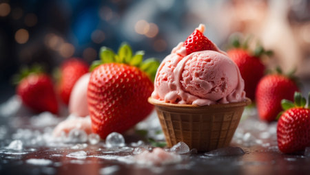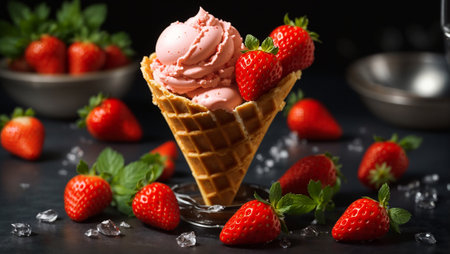 Strawberry ice cream in a waffle cup, fresh strawberries, mint, ice
