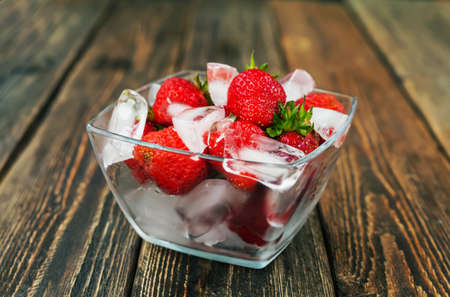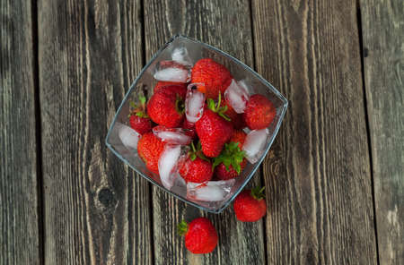 Strawberries with ice in a glass vase. Top view. Wooden table. A hot summer day.