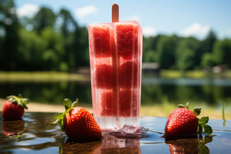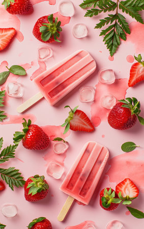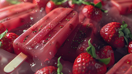 Frozen strawberry popsicles. AI generative.