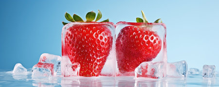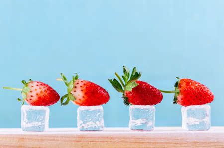 Strawberry frozen in ice cube on blue background, refreshing concept.