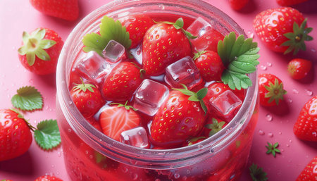 Close-up of red strawberries in pink strawberry jam with ice cubes and green leaves scattered on top.