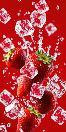 Fresh strawberries splashing with ice cubes in a vibrant red background