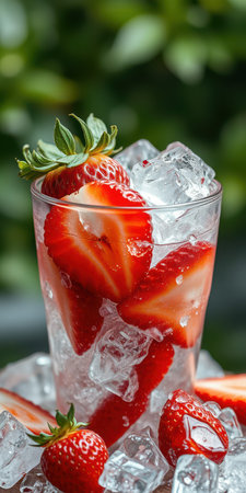 Fresh strawberries nestled in ice for a refreshing summer treat in a glass bowl