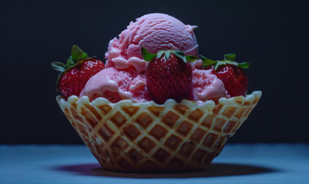 Strawberry ice cream in a waffle bowl closeup