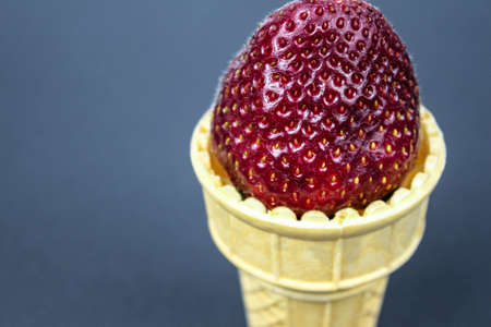 Straberrry in waffle cone - healthy dessert concept on black background