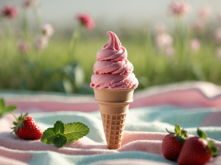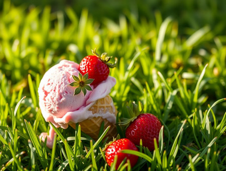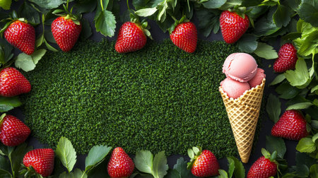 Strawberry Delight Pink Ice Cream Cone on Green Grass with Fresh Strawberries Frame.