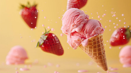 Waffle cones with delicious strawberry, vanilla and mango ice-cream on yellow color background. Levitating ice-cream and strawberries on a yellow background.