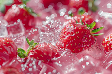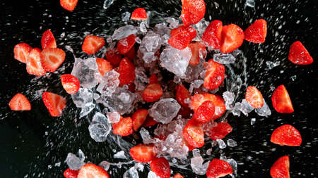 Refreshing strawberry with ice cubes and splashing water