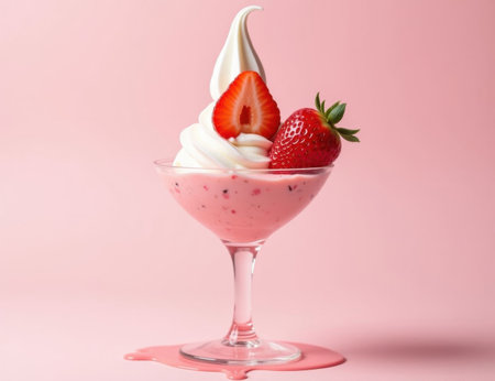 Strawberry ice cream with fresh strawberries in a glass on pink background.GenerativeAI.