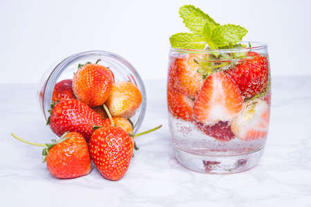 Strawberries, fresh mint wet background