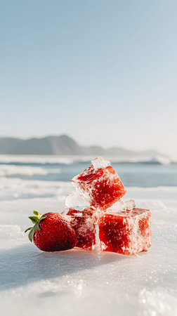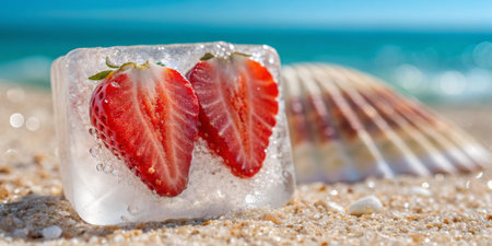 Fresh strawberries encased in ice shine under the warm sun by the sea, evoking summer bliss.