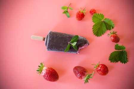 Strawberry popsicles with fresh strawberries on a dark background.