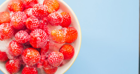 Frozen strawberries and white dishes